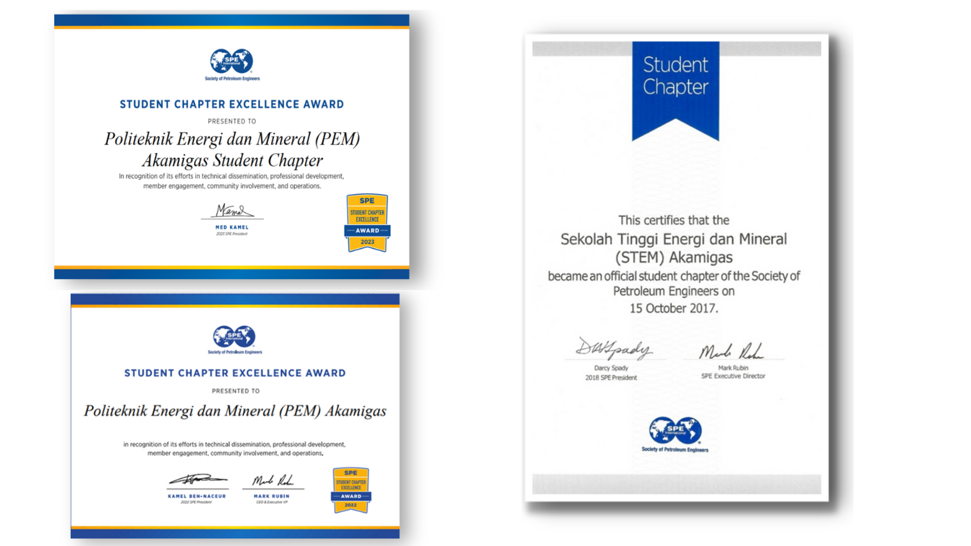 Society of Petroleum Engineers Politeknik Energi & Mineral Akamigas Student Chapter (SPE PEM AKAMIGAS SC) was established in 2017. SPE PEM AKAMIGAS SC aims to elevate understanding of the world's energy sources to each one of its elements by exposing them starting from the basic knowledge until the advanced technologies and recent developments in the industries. SPE PEM AKAMIGAS SC intends to become the game changer of energy, especially in oil and gas industry, where our work is demonstrated professionally are proven internationally through unceasing professional competence.